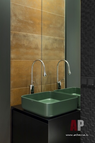 Центральным помещением стал open space гостиной, столовой, кухни, прихожей с условным зонированием и возможностью кругового движения. Из общей зоны организованы входы в личные помещения: спальню родителей, детскую и кабинет. В квартире спроектировано три санузла: маленький гостевой, детский и родительский. «Заказчица – человек прогрессивных взглядов, она была готова к смелым решениям и поддержала нашу идею со стеклянной перегородкой между спальней и ванной комнатой», - отмечают архитекторы.