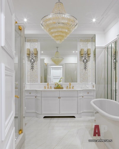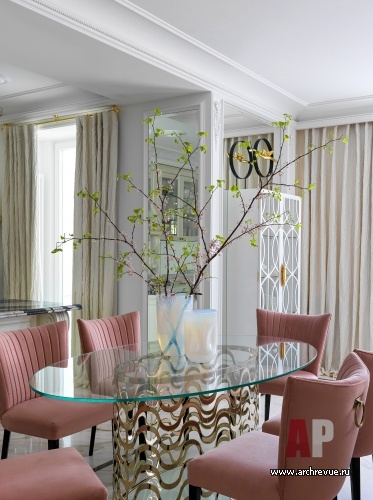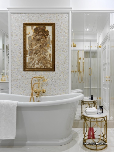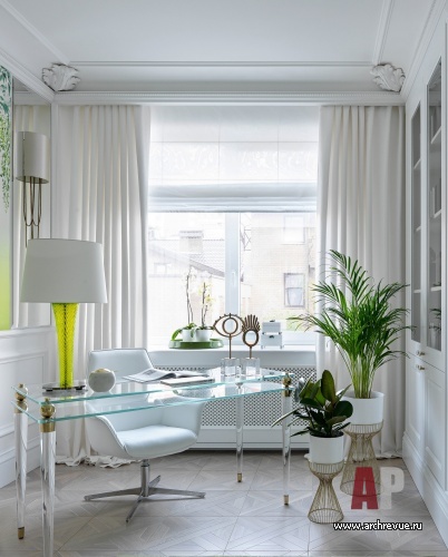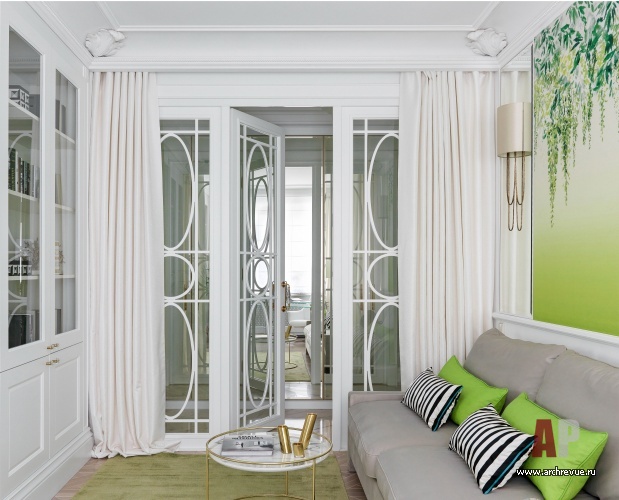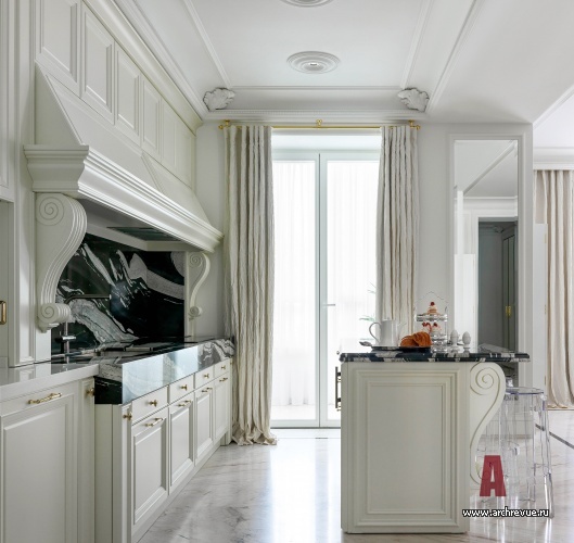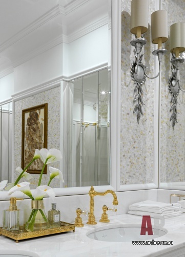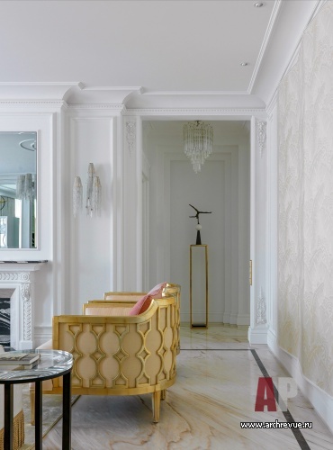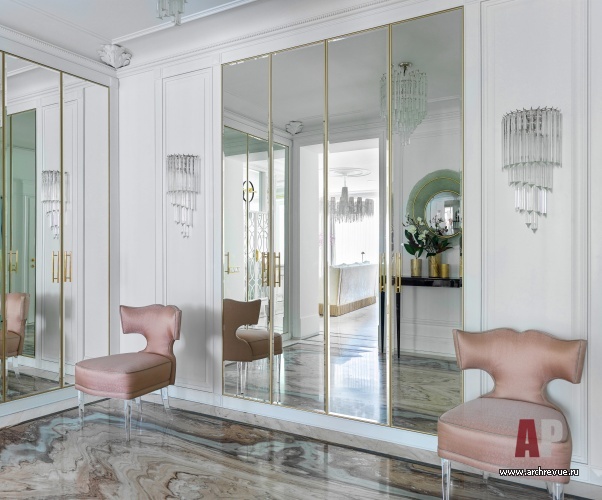 Интерьер квартиры выполнен в парадном классическом ключе, вдохновением для нее стал образ французского сада: изысканного и нежного. Ощущение легкости, простора и света создают зеркала и прозрачные витражи, отделка поверхностей в белых тонах, паркет из выбеленного дуба, светлый полированный мрамор с нюансной текстурой. Фактурность придает изящный лепной декор: карнизы, ажурные виньетки, розетки и молдинги подчеркивают геометрию и дают ощущение индивидуального интерьера с рукотворными деталями.