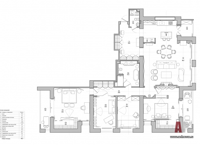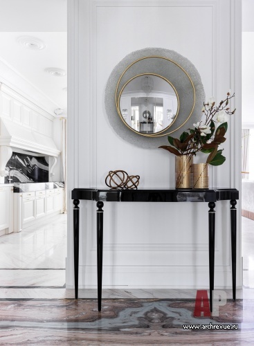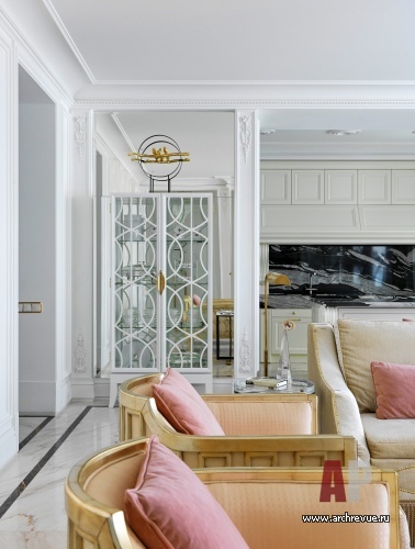 Г-образная форма квартиры позволила разделить ее на две автономные части: зону гостиной, кухни, столовой и удаленный от входной группы блок приватных помещений. Общее пространство организовано по анфиладному принципу: камин, мягкая группа, столовая и кухня расположены строго по одной оси. Два симметричных открытых проема связывают open space и выполненную в парадном стиле прихожую, создают ощущение единого большого и светлого пространства.