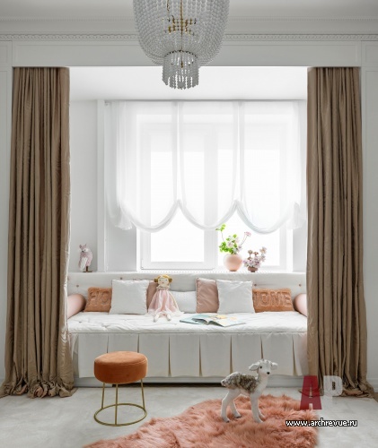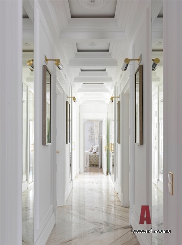 В блок приватных помещений ведет коридор: зеркала, витражные двери, ритмичные гипсовые карнизы и светлая палитра позволили избежать ощущения длинного, узкого и темного буферного пространства. Здесь находится хозяйская спальня, кабинет, детская и гостевая комната. Полезную площадь квартиры удалось увеличить за счет присоединения лоджий, например, в спальнях на них разместились комфортные зоны отдыха.