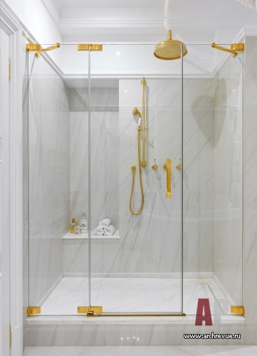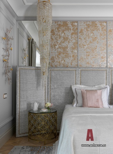 С белыми стенами и светлой корпусной мебелью контрастирует темный гранит с редким эмоциональным рисунком, а также пудрово-розовый текстиль и золотистая фурнитура из латуни. Она наполняет интерьер теплым свечением. В спальне на первый план выходят жемчужно-серые дизайнерские ткани, которыми, как роскошной ширмой, оформлено изголовье кровати. В кабинете – текстильное панно с изображением глицинии насыщенного зеленого цвета, оно привносит в монохромную квартиру ощущение свежести и вечного лета.