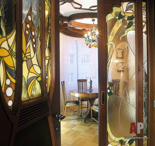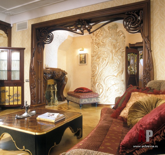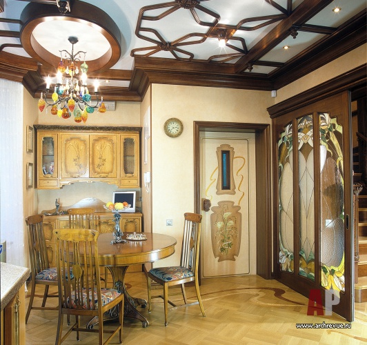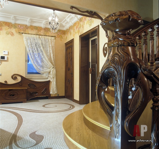 Хозяевам хотелось создать интерьер в лучших традициях начала ХХ века – в стиле модерн или ар-деко. Они хотели, чтобы дом был наделен яркой индивидуальностью и был похож на сказочный. Архитекторы предложили исполнить интерьеры в духе русского модерна с чертами неоготики и необарокко.