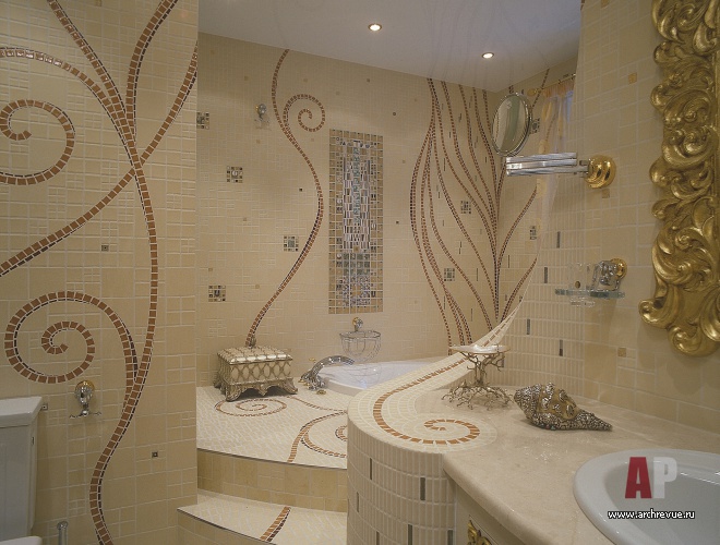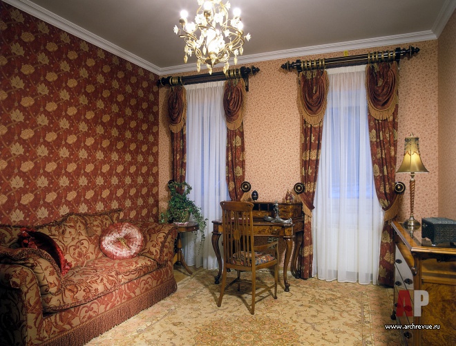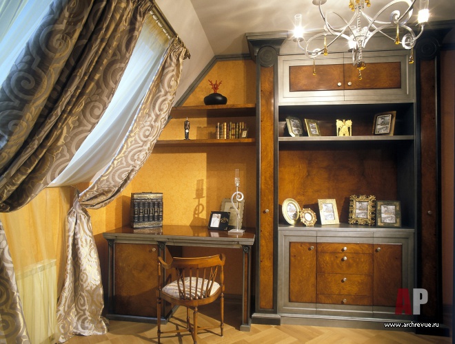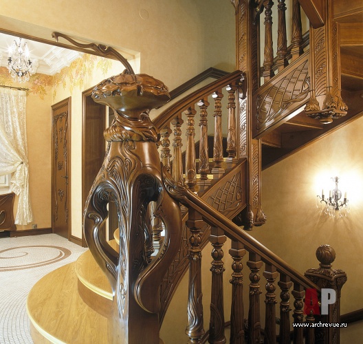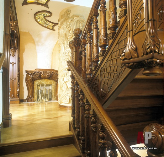 Практически все элементы декора здесь выполнены на заказ, по эскизам архитекторов, в единственном экземпляре и ручным способом. Часть мебели была сделана по чертежам авторов проекта на известных итальянских фабриках с учетом особенностей общего дизайнерского решения. Встроенная мебель, резные порталы дверей и камина, а также скульптурная лестница выполнены российскими мастерами. Как и лепнина, керамика, настенные росписи.