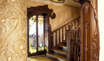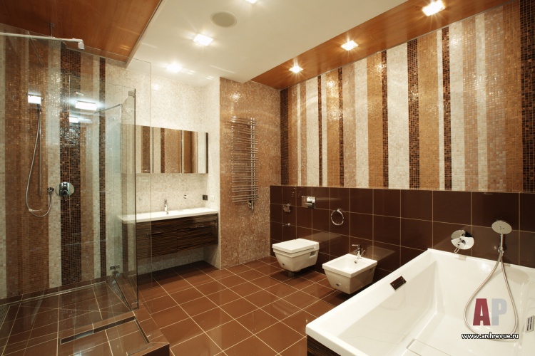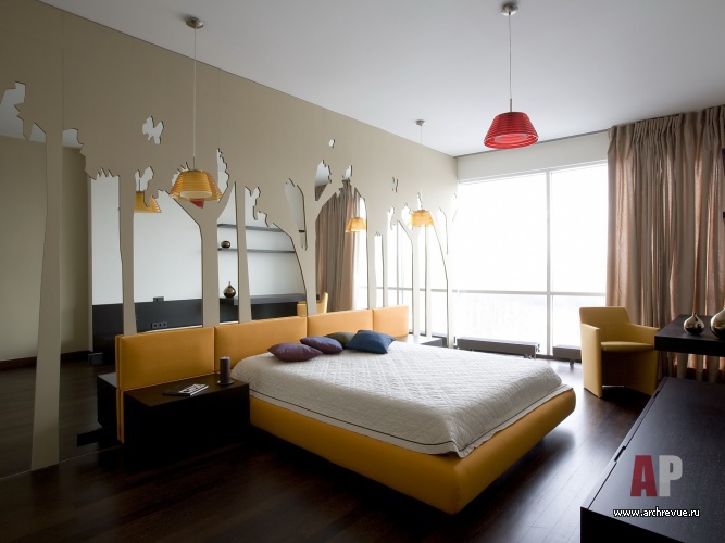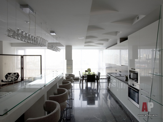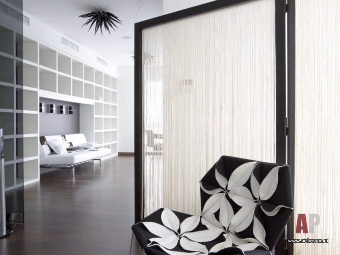 Функциональные зоны выделены с помощью архитектурно-декоративных решений: гостиную от кухни отделяет барная стойка, столовую зонирует фальшкамин, а кабинет –стеклянная перегородка и ширма с занавесом, состоящим из множества тонких нитей.
