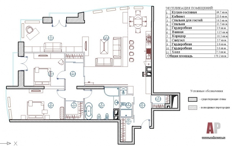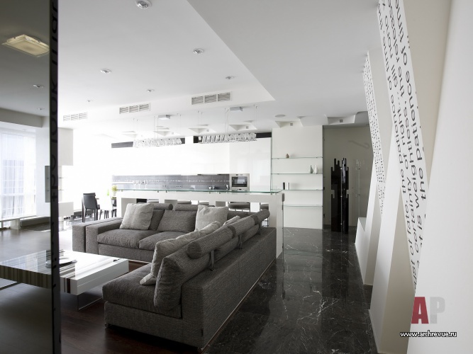 Квартира на высоком этаже современного жилого комплекса спроектирована по принципу студи. Основное пространство занимают парадные помещения – общая зона, состоящая из кухни, столовой, гостиной, кабинета и коридора. Приватные помещения с двумя спальнями (гостевой и спальней хозяина), гардеробными и большой ванной комнатой расположены за стеклянной перегородкой.
