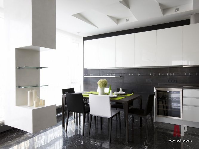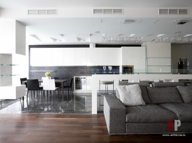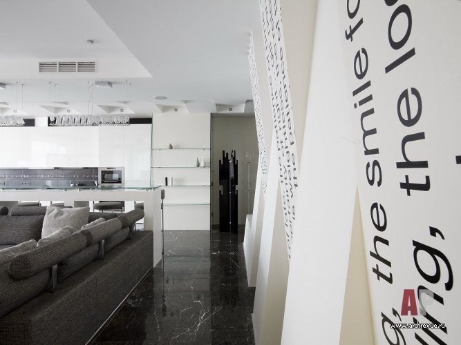 Основная цветовая гамма интерьера квартиры – контрастная, черная с белым, поэтому авторы сделали акцент на фактуру материалов: мрамор и венге.