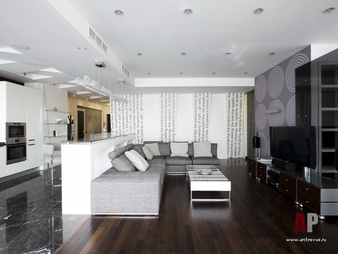 Декоративный акцент гостиной – стены, выполненные из чередующихся наклонных блоков. Они выполнены из гипсокартона, декорированы текстовым принтом и оборудованы светильниками, которые усиливают эффект, создаваемый ритмическим чередованием наклонных плоскостей.