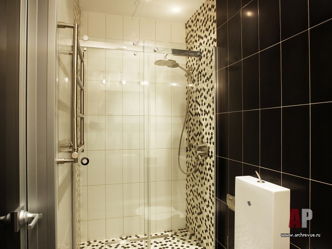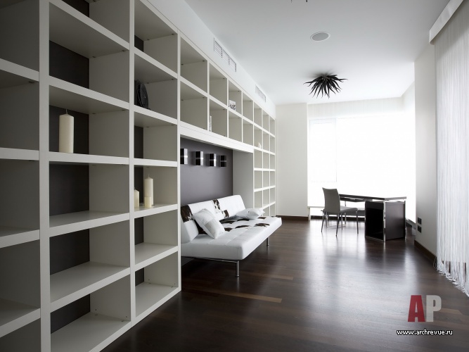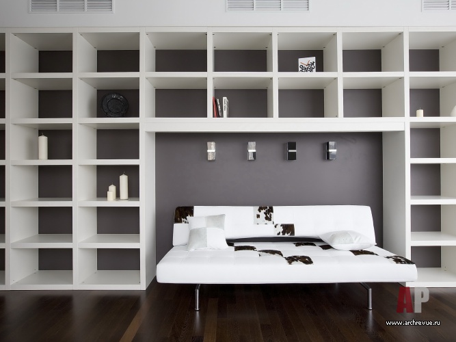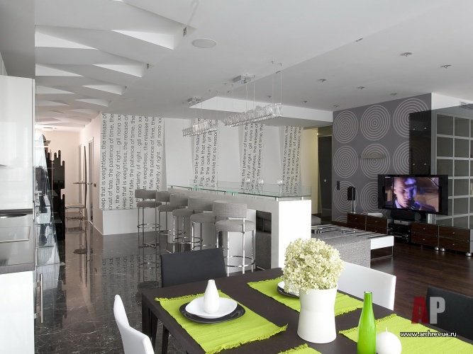 Активный декор – один из способов уйти в монохромном интерьере от строгости. Так появились наклонные плоскости с текстом и декоративный финиш из крупных кругов.