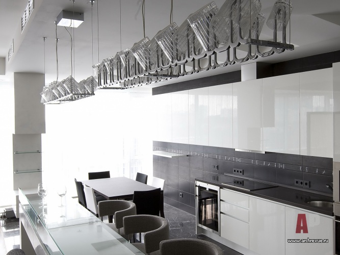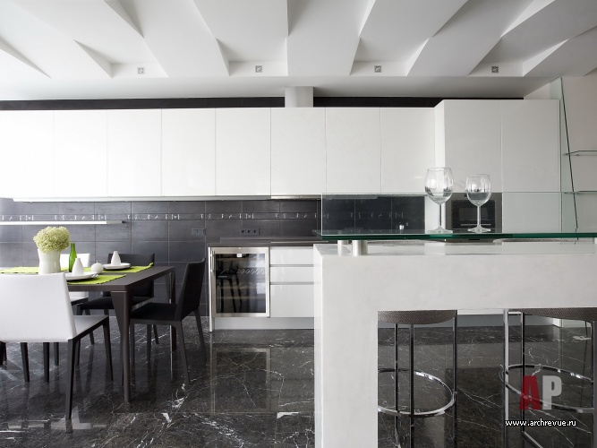 Чтобы создать ощущение легкости, авторы использовали материалы с блестящими поверхностями. Полированный мрамор на полу, лакированные фасады кухни, элементы из стекла и металла – за счет них черно-белый интерьер выглядит мягче. Завершающий штрих – трендовая мебель от ведущих европейских дизайнеров.