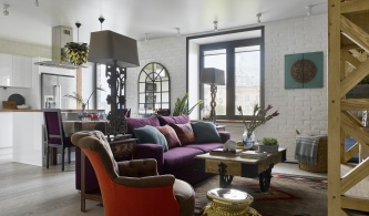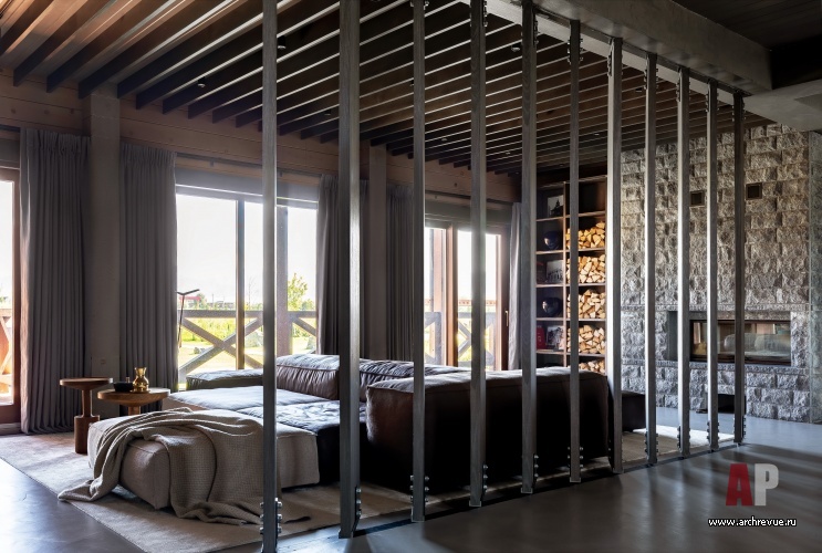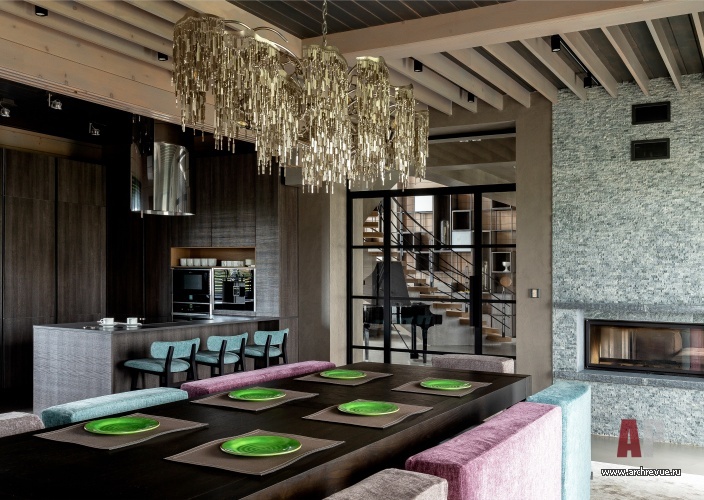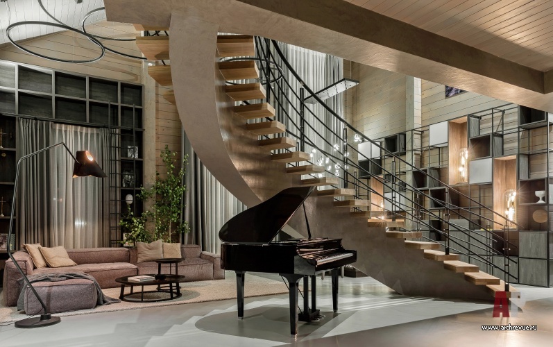 Поскольку дом разрастался в процессе строительства, он состоит из двух объемов. В основном объеме расположен холл и двусветная гостиная с баром и зоной для отдыха, а также блок кухни и столовой. Пространство за винтовой лестницей появилось позднее: центральное место здесь занимает двусторонний диван, одна его сторона обращена на каминный зал, другая – на телевизионную зону.