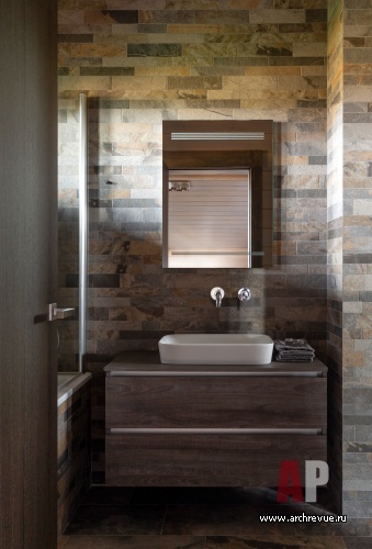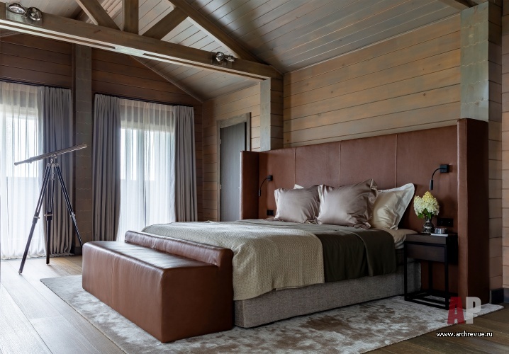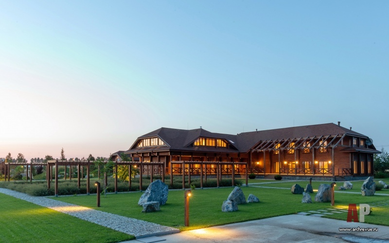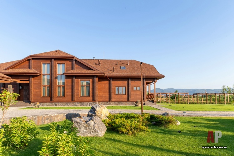 В качестве основного строительного материала был выбран местный кедр, который хорошо держит тепло и устойчив к сложным климатическим условиям с холодными ветрами и проливными дождями. Двухэтажный дом проектировался в два этапа. Изначально заказчик видел здесь небольшую дачу, где можно жить не больше месяца-полутора в год. Поэтому проектировать начали одноэтажный дом площадью до 400 кв. м, состоящий из общей гостиной и трех спален. В процессе он захотел добавить бильярдную и сауну, спальни для друзей и полноценный хозяйственный блок с помещениями персонала и погребом для хранения вина и продуктов. Так дом увеличился вдвое, появился второй этаж и выразительная крытая галерея, которая соединила главную постройку с домом для персонала и гаражом в единый усадебный комплекс. Архитектура дома подчинена его месторасположению, каждая деталь спроектирована с учетом северного характера. Стены из кедрового бруса, словно укрывающая окна кровля, шунгит в облицовке фундамента… Дом выглядит строго и лаконично, но вместе с тем он составляет единое целое с окружающим пейзажем. Ландшафтные особенности данной местности имитирует и созданный архитекторами вместе с партнерами сад. Рукотворный ландшафт с пологими холмами и крупными деревьями, которые ослабляют потоки ветра, защищает территорию от суровых природных явлений.