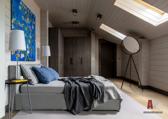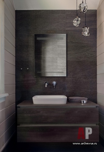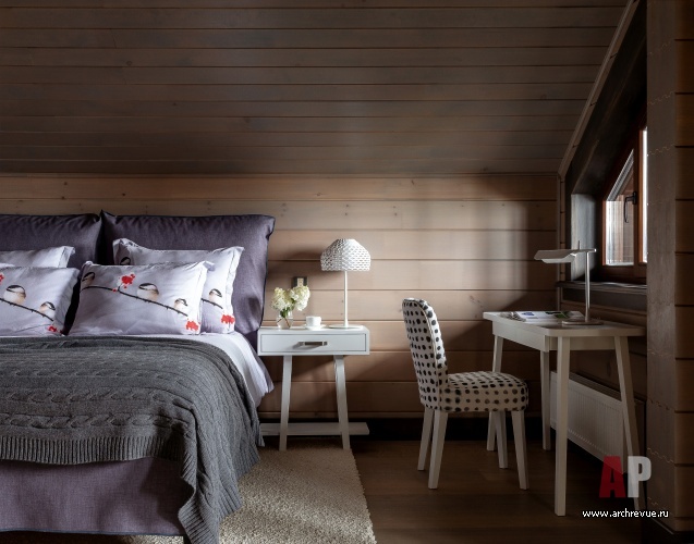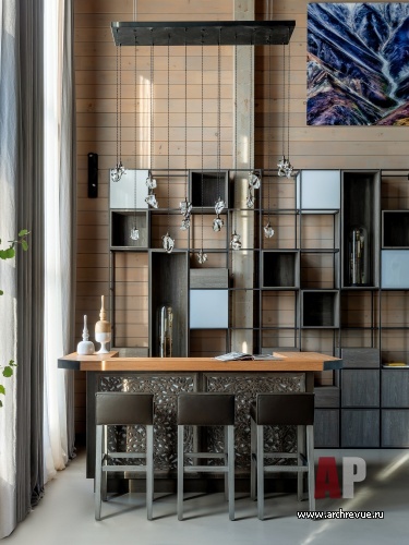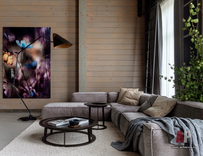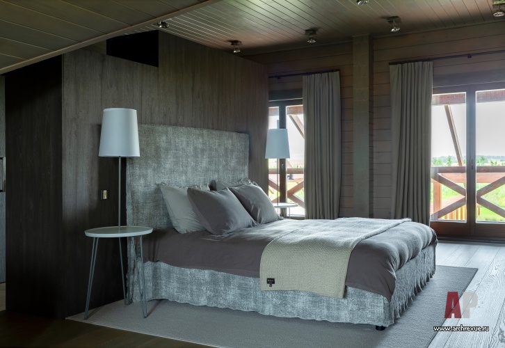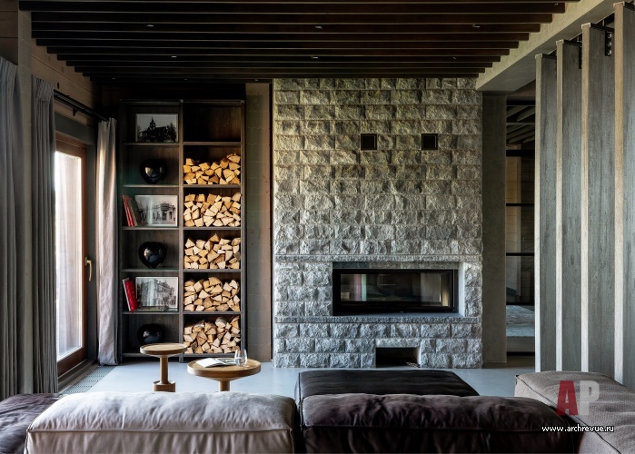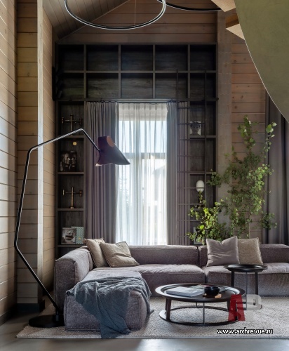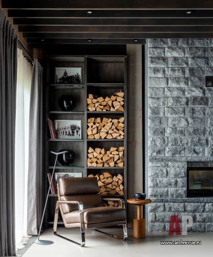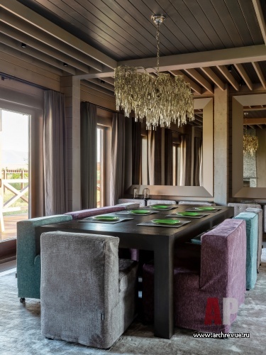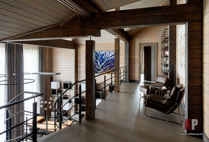 Пространство выполнено в оттенках серого: основного теплого светлого и акцентного более темного серо-коричневого. Все стены и потолки в доме одного цвета, а балки, плинтуса – темнее. Интерьер строится на игре холодных и теплых материалов: с деревом стен контрастируют наливные цементные полы, с брутальным камнем – изделия из металла. «Изначально была идея сохранить черновой бетон на лестнице и в других видимых местах. Но бетон у местных строителей не удался, поэтому мы решили покрасить его фактурной краской под цвет наливных полов», - рассказывают авторы проекта. Так как дом предназначен для сезонного проживания и кратких визитов, то решено было отказаться от дорогостоящей дизайнерской мебели в пользу разработанных на заказ характерных предметов. Вся мебель была привезена из Голландии. Лаконичные изделия из дерева с проседью и брутальной фактурой перекликаются с суровой алтайской природой и подчеркивают красоту простых материалов.