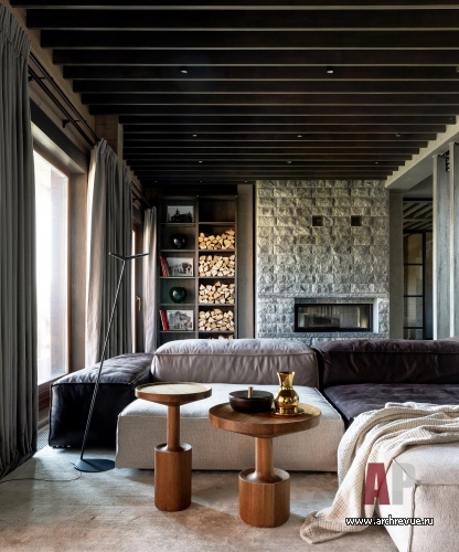 Зона у камина кофейные столики Linteloo (модель Kigi), диван Living Divani; полки и поворотные ламели, на заказ, по индивидуальным чертежам изготовление Rick Smeenk