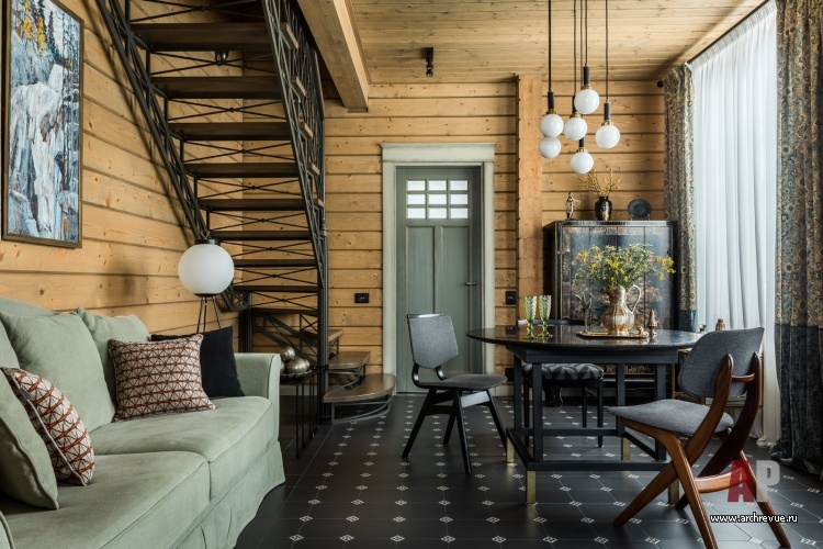 При оформлении дома дизайнер стремилась подчеркнуть связь интерьера с окружающей природой. Поэтому в нем много открытого дерева, а в цветовой гамме преобладают оттенки земли, листвы, древесной коры… Стены и потолки в большей части помещений оставлены деревянными: легкую тонировку дает масло. На полу гостиной – классическая черная плитка, которая в зоне кухни сменяется аналогичной белой.