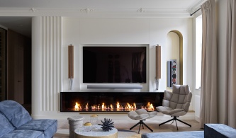 Это получилось во многом благодаря проходной кухне, в которую можно попасть как из прихожей, так и из гостиной. Хотя сначала дверь из гостиной на кухню даже не увидишь: она обыграна как раздвижной стеллаж из белого глянца и латуни. Эффектная композиция со строгой геометрией и деликатно сияющими полками служит мощным декоративным акцентом общей зоны и позволяет с легкостью трансформировать пространство, делает его сквозным. К гостиной примыкают две спальни с общим холлом и ванной комнатой.