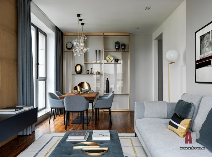 Стилистика квартиры полностью соответствует характеру этой молодой семьи: спокойный, почти монохромный фон, построенный на оттенках серого и графита, и яркие золотые акценты. В гостиной ими являются раздвижной стеллаж с латунными полками и стена за ТВ, облицованная панелями из матовой латуни с теплым свечением.