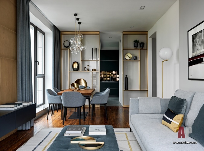 Квартира площадью 101 кв. м расположена в новом ЖК Red Side, она проектировалась для молодой семейной пары с ребенком, функционально нужно было разместить две спальни и большую общую гостиную, а стилистически – придумать интересные дизайнерские «фишки», запоминающиеся, но элегантные. Ключом к образу интерьера стала нейтральная серая палитра, теплое дерево и изделия из латуни с характерным теплым матовым, очень благородным свечением.