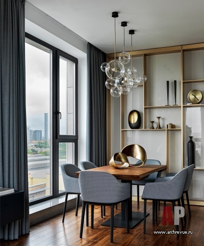 Столовая стол Cattelan Italia (модель Elvis Wood Drive), стулья Vitra (модель Softshell Chair); стеллаж, на заказ, по чертежам архитекторов – изготовление Wood interiors