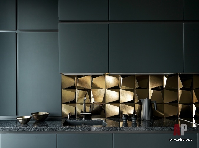 При открытом дверном проеме в декоративную игру вступает еще один «золотой» объект: объемная керамическая плитка, которой выложен фартук на кухне. В целом интерьер отличают точно выверенные детали и сочетания цветов, фактур, форм и объемов. Дерево здесь контрастирует с серым брутальным камнем, белый глянец с «жидким золотом», строгие линейные формы с простыми круглыми светильниками и аксессуарами.