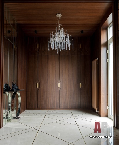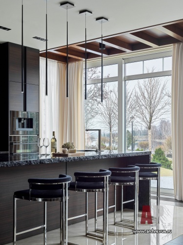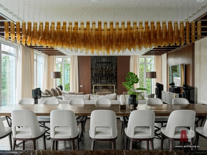 В оформлении интерьера использованы статусные материалы: панели из шпона ореха, природный камень, зеркала с фацетами. Обеденный стол выполнен из цельного куска карагача, барная стойка облицована брутальным гранитом с колотым краем, а центральная 5-тиметровая люстра вручную собрана из золотистых стеклянных трубочек.