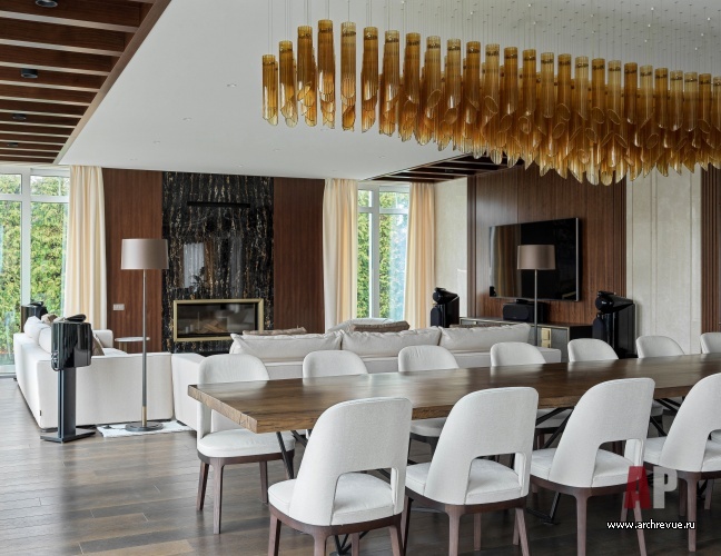 Здесь находится каминная группа, зона ТВ, большой обеденный стол на 16 человек и профессиональная кухня с баром (ее максимальный функционал скрыт за лаконичными деревянными фасадами). Раздвижные окна в пол с трех сторон помещения дают возможность превратить дом в уличную беседку с выходом на открытую террасу у воды.