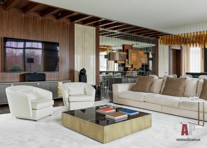 Яркий декоративный акцент гостиной – панно из разных видов дерева с натуральной текстурой, тонировкой и патиной, выполненное художником специально для этого интерьера. Размещенное на зеркальной стене оно ассоциируется с богемными интерьерами Эпохи Джаза. Особое внимание дизайнер уделила тактильности предметов и контрастам фактур: теплое натуральное дерево, мебель с мягкой уютной обивкой, пестрый гранит и холодный гладкий мрамор создают контраст ощущений и атмосферу, которая одинаково подходит как для семейного отдыха, так и для веселых праздников. Умиротворяющую и динамичную одновременно.