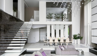 Выбирая трендовую цветовую палитру и модную мебель, архитекторы все равно возвращаются к классической архитектуре. Ее поддерживает гипсовая раскладка по стенам, белый камень Калакатта и напольная плитка с витиеватым орнаментом в духе отделки итальянских палаццо.