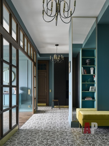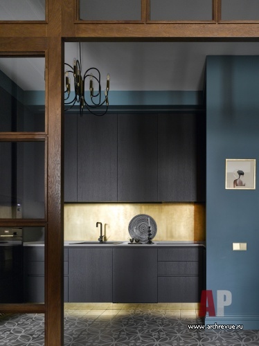 И хотя заказчики больше говорили о классическом стиле, изучая мебельные стенды, авторы проекта невольно «примеряли» новинки к проекту. Обтекаемые формы мебели, отделка из приглушенной латуни и сложный сине-зеленый тон пришлись по вкусу заказчикам и стали основой дизайнерского решения.