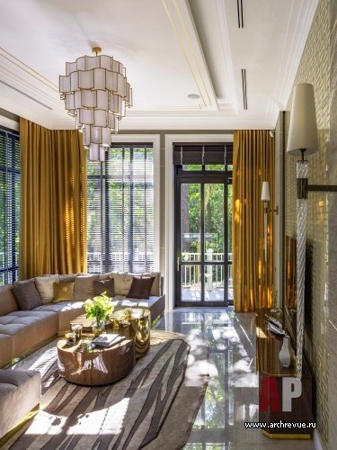 Благодаря тому, что работа над проектом дома шла параллельно с разработкой дизайн-проекта интерьеров, удалось учесть все пожелания заказчика по планировке и расположению помещений, а также по инженерным решениям: монтажом систем климат-контроля, аудио и видео-оснащением и прочими техническими особенностями, которые ассоциируются с премиальным загородным жильем. Главной задачей внутреннего оформления стало создание пространства, которое служит продолжением природного окружения. Отсюда и высокие витражные окна, и сквозная планировка, дающая солнечному свету свободно проникать в помещения, и теплая палитра. Не случайно выбрана и стилистка ар-деко: она помогает подчеркнуть статус заказчика и особое отношение к жизни.