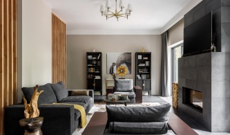 Логичная и четкая планировка, хорошее качество инженерии и строительных работ, отличные стеклопакеты с деревянными рамами, и только балки над всеми окнами портили картину, - рассказывает автор проекта. – Мы решили их не прятать, а наоборот, подчеркнуть. В итоге появилась черная «рама», которая обозначила геометрию, добавила интерьеру классической строгости и определила выбор в пользу современной лаконичной мебели».