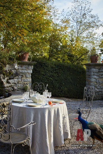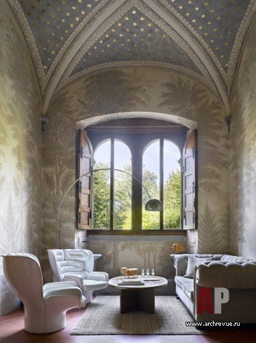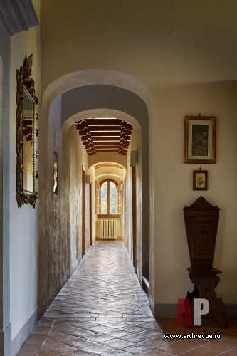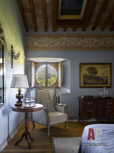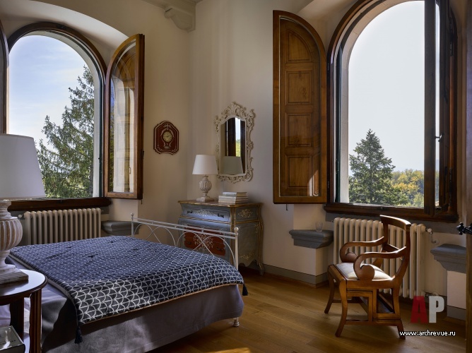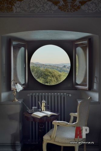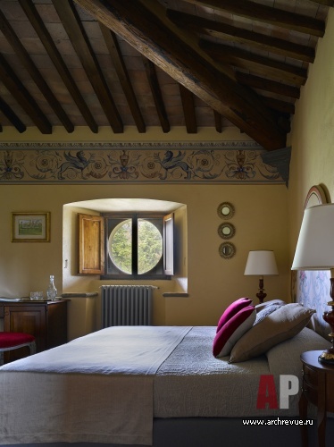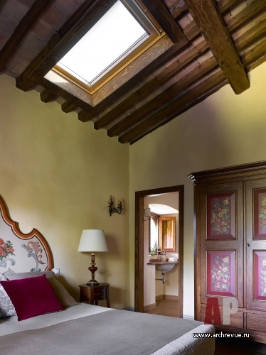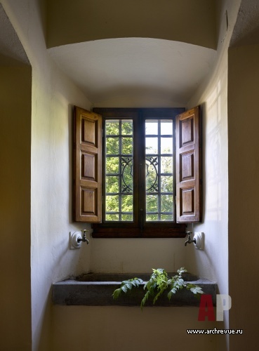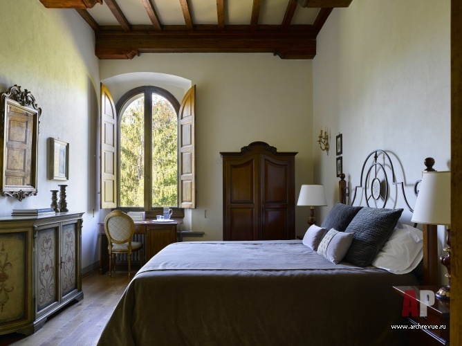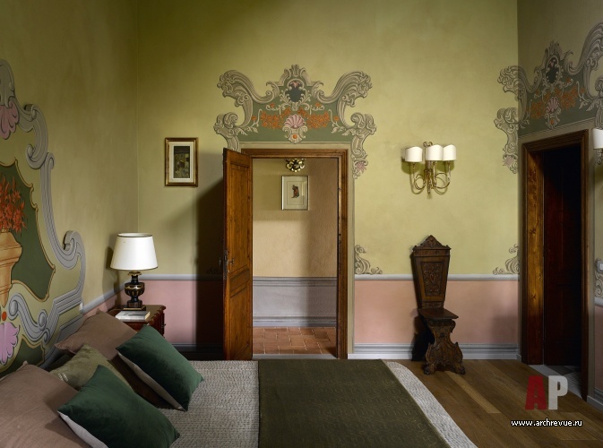 Пока Стефан Зарков занимался кровлей и художественной реставрацией росписей на фасаде и в интерьере, Наталья изучала местные ремесленные мастерские и антикварные магазины. Деревянные ставни, массивные двери, роскошные кессонные потолки были тщательно отреставрированы силами итальянских мастеров. Был облагорожен камин: дизайнер сохранила портал из серого камня с изысканной металлической панелью и украсила дымоход росписями с изображением павлинов. Когда снимали старую штукатурку с потолка в парадной столовой, то обнаружилась роспись с ангелами и оливковыми листочками, которую конечно сохранили. Интересно шла работа над оформлением спален: дизайнер вдохновилась традиционным итальянским декором и оформила кровати резными навершиями, щедро украшенными росписями.