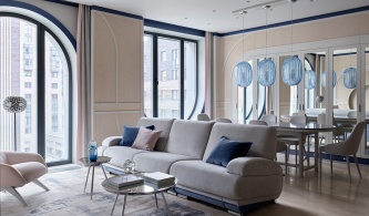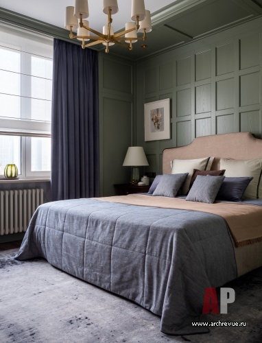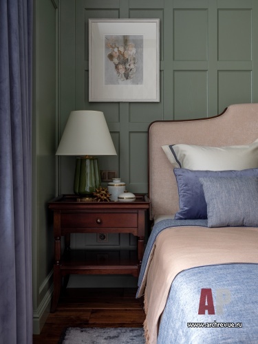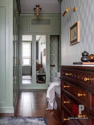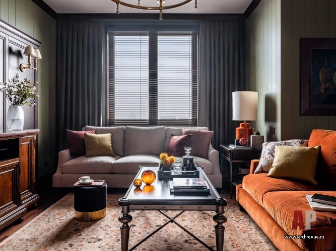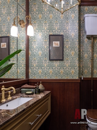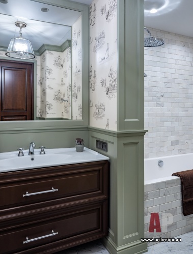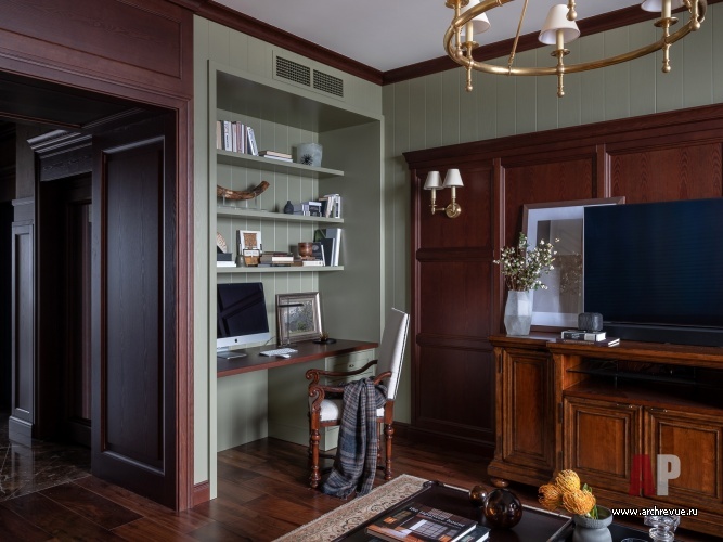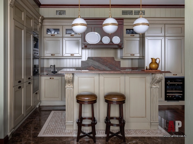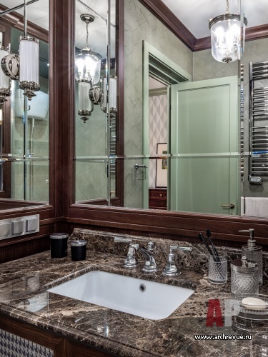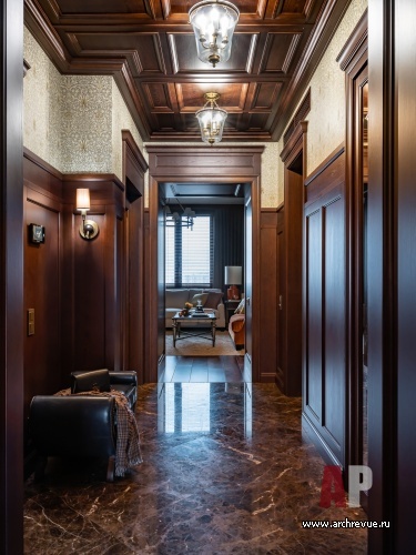Интерьер квартиры выдержан в духе американской классики, которая предполагает симметричные решения, массивные предметы мебели, отделку стен и потолков деревянными панелями и акцентный колониальный декор. Архитекторы сделали ставку на натуральные материалы: мрамор в отделке мокрых зон, дерево на полу и стенах.