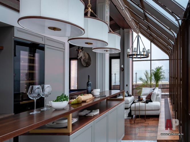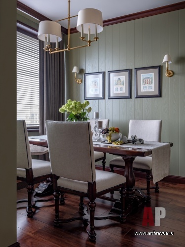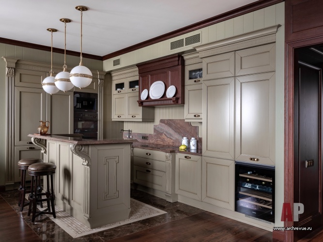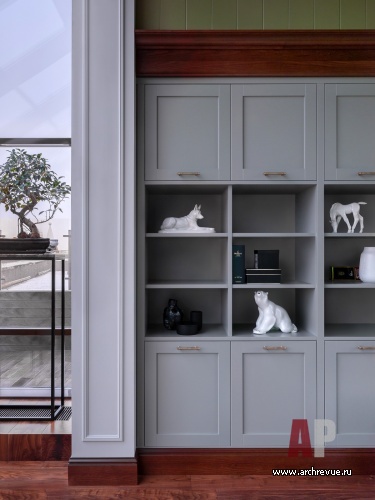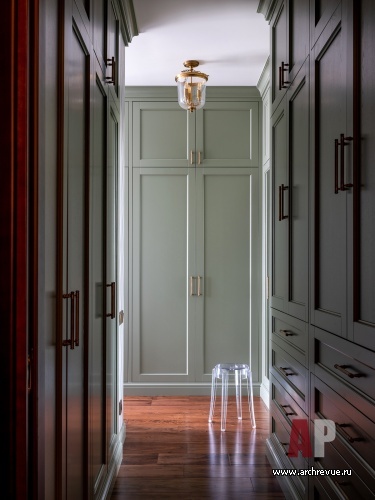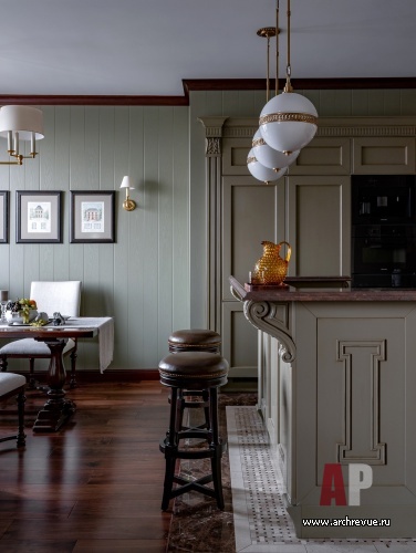 Связать их удалось при помощи встроенного лифта, который благодаря продуманной звукоизоляции движется практически бесшумно. Стилистически заказчики хотели интерьер с атмосферой, напоминающей загородный дом: теплой, уютной, расслабленной. Авторы проекта предложили обыграть классическую американскую стилистику, наполнить интерьер теплыми оливковыми оттенками и «согревающими» фактурами дерева.