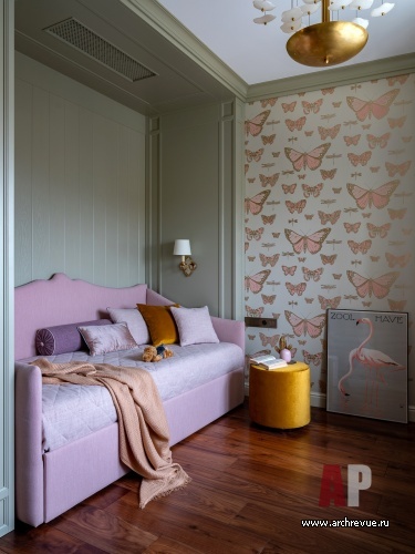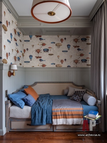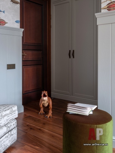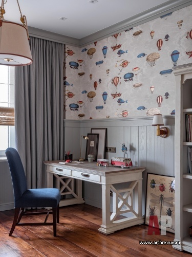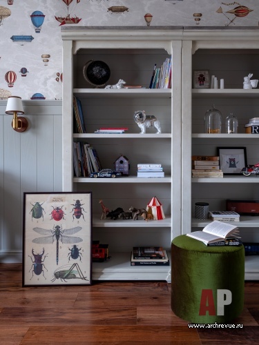 Практически во всех помещениях стены зашиты деревянными панелями: они разной конфигурации и высоты, но единого цвета и фактуры – темный дуб и теплый оливковый тон. Детские комнаты объединяют светлые тона, но они отличаются по «тематике»: в комнате мальчика читается мотив воздухоплавания, в комнате девочки — летящие лепестки и бабочки на стенах. Интересный акцент сделан в третьей детской, которая сейчас используется семьей как игровая комната: широкий фриз оформлен постерами с изображением героев комиксов Marvel.