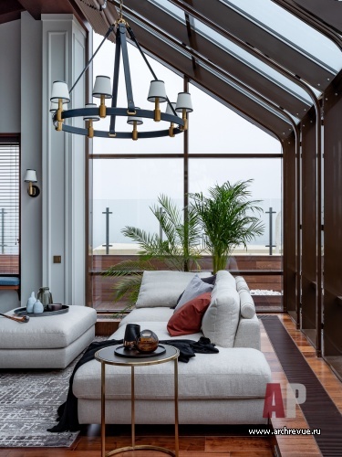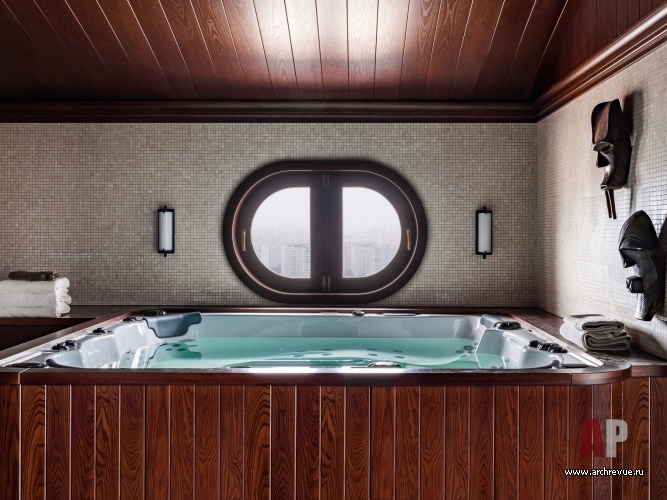 Верхний уровень с панорамным остеклением – место для приемов гостей, семейных мероприятий и дружеских вечеринок. Центральное место занимает зона отдыха с барной стойкой, 12-футовым бильярдным столом и выходом на открытую террасу с видом на город. Рядом с ней расположена домашняя СПА-зона с мини-бассейном и хаммамом, которые не часто встретишь в московской квартире.