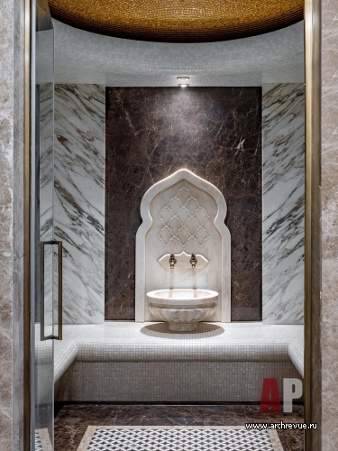 Отделка второго этажа более сдержанная. Здесь прекрасный вид из окон, поэтому не было необходимости применять сложные решения и текстуры. Стены выкрашены в светло-серый цвет на полу – мрамор Bianco Carrara и доска из американского ореха, а потолок подшит деревянными панелями в тон карнизам и дверям. «Это был непростой проект по количеству заложенной инженерии. Вентиляция и кондиционирование, увлажнение воздуха, управление отоплением и слаботочными системами, шторы с электроприводом, встроенный лифт и оборудование джакузи и хаммама потребовали серьезных инженерных расчетов и слаженной работы подрядчиков», - отмечают авторы проекта.