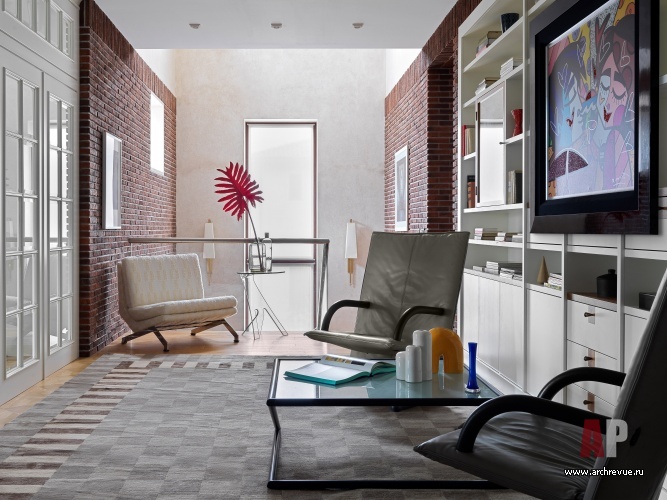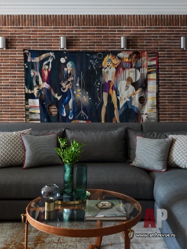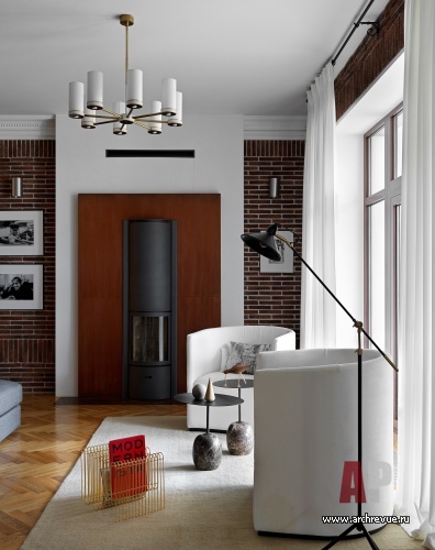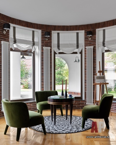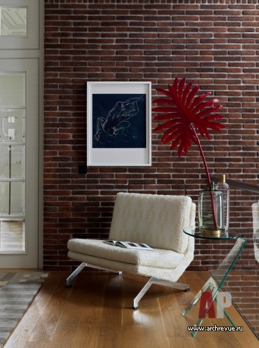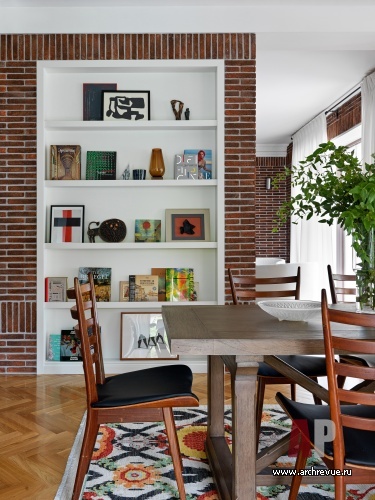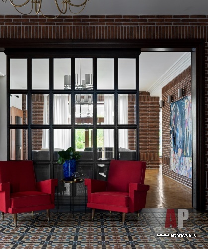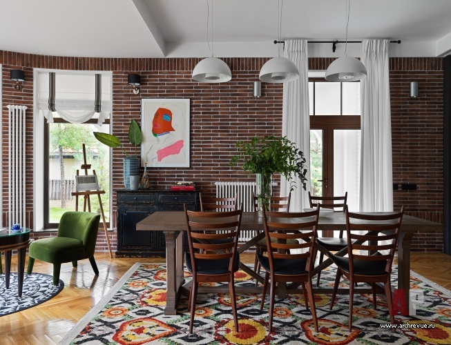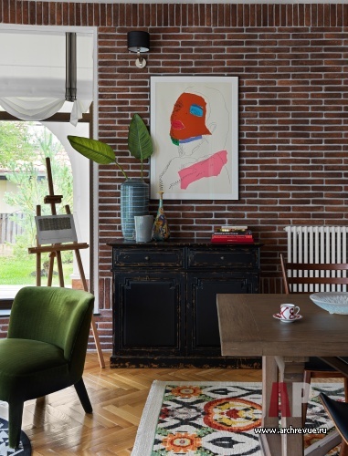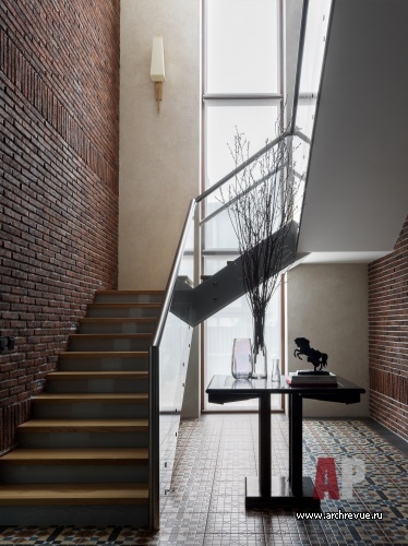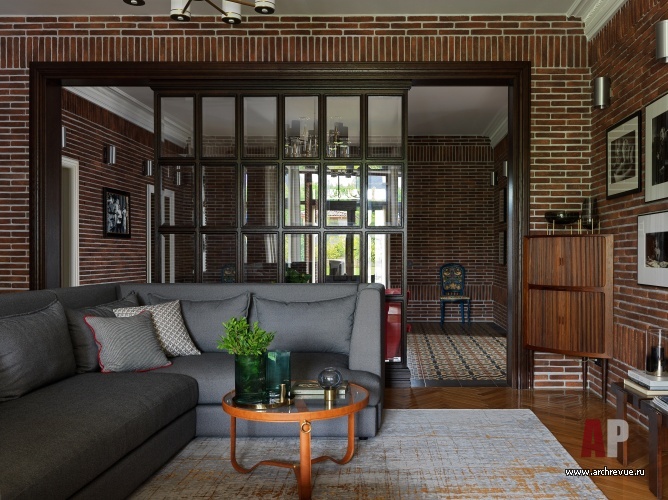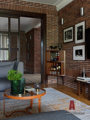 «Никакой другой материал не давал интерьеру той брутальности, которую хотел хозяин дома, – рассказывает автор проекта. – Но в то же время важно было не переборщить, не превратить семейное жилье в лофт». Площадь стен, оформленная кирпичом, внушительная, но брутальная фактура не доминирует благодаря грамотному балансу дерева, лепнины, цветной керамики, латуни, кожи, фактурного текстиля. Паркет-елочка, витражи-перегородки с фацетами, лаконичный камин с порталом из металла усложняют интерьер, наполняют его теплом и создают ощущение обжитого пространства. Этой же задаче служат винтажаная мебель, дизайнерские светильники и коллекция искусства из собрания семьи – харизматичные вещи с характером и историей.
