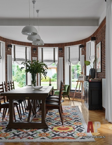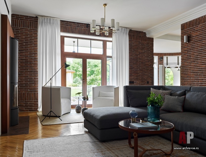 «Заказчики приобрели участок в живописном Подмосковье и решили построить семейную резиденцию, где можно жить в единении с природой, - рассказывает дизайнер. – Работа над дизайн-проектом шла параллельно с проектированием дома, поэтому нам удалось реализовать все пожелания клиента и оперативно добиться результата». Например, заложить в проект и обыграть в интерьере открытые совмещенные пространства, большие панорамные окна-перегородки, которые позволяют любоваться садом и дают возможность выйти на террасу из гостиной, столовой и кухни. А также спроектировать классический полукруглый эркер, в котором угадываются отголоски другой эпохи – светлый, наполненный воздухом, с красивыми природными перспективами. В итоге получился немного брутальный, но необычайно благородный интерьер с кирпичными стенами, натуральными фактурами и насыщенной осенней палитрой.