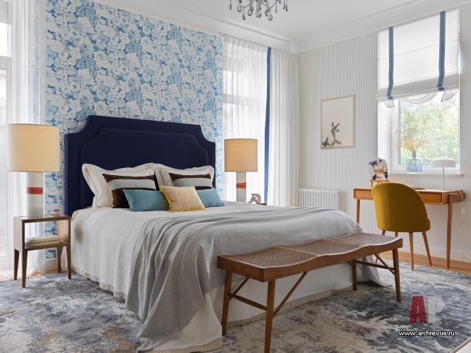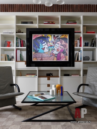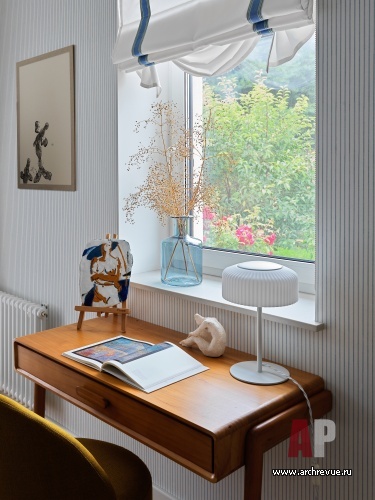 Кабинет стеллаж выполнен на заказ по эскизам дизайнера; кресло Arflex, винтаж, Италия, 1980-е гг.; стол, винтаж, Голландия, 1960-е гг.; кресло Formanova, винтаж, Италия, 1960-е гг.