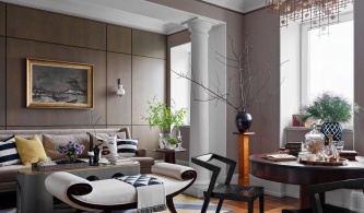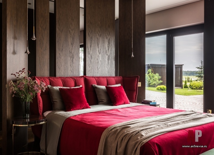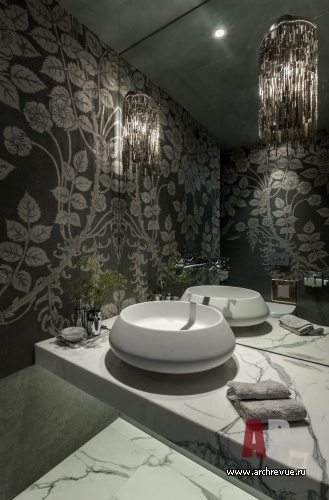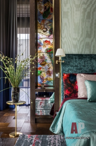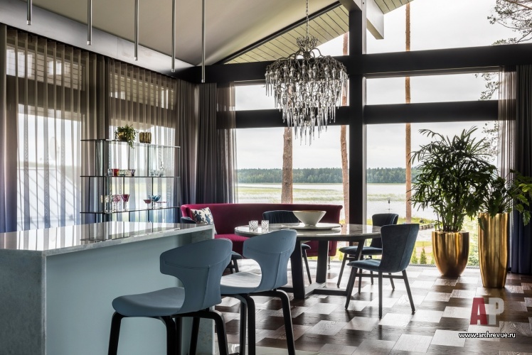 Интерьеры дома необычайно разнообразны, они выполнены в эстетике bespoke и максимально персонифицированы. Парадные пространства – это элегантный микс из американского ар-деко, выполненный в красках природы озерного северного края. Хозяйская спальня выглядит романтично за счет витражей по мотивам плафона Гранд Опера в изголовье кровати и радиусной перегородки из молированного стекла с изображением фламинго в ванной комнате. А SPA-зона оформлена в цветовой гамме турецкого курорта Памуккале, славящегося своими соляными горами и голубыми озерами. Элегантная бирюза, нежная зелень, насыщенный красный, акценты из латуни придают интерьерам яркий колорит и создают праздничную атмосферу.