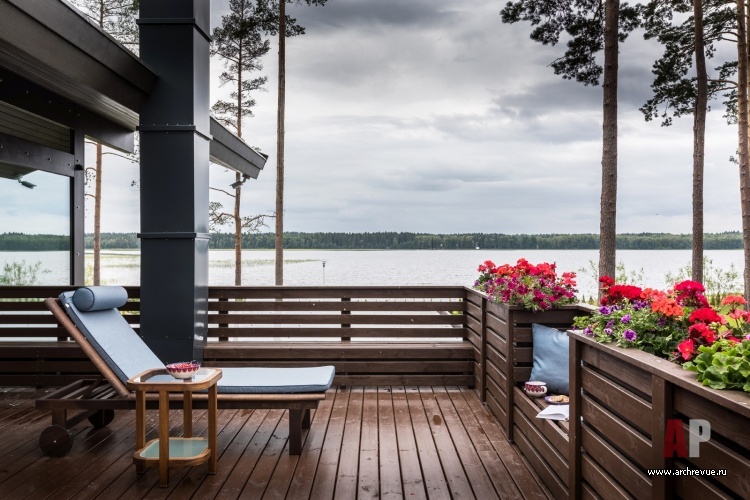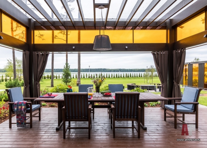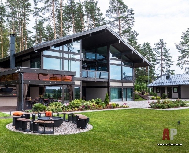 Архитектурное бюро под руководством Юлии Черкун реализовало масштабный проект: современный фахверковый дом, расположенный на берегу озера с видом на водную гладь, где воедино связало интерьер, экстерьер и ландшафт. Трехэтажный дом с панорамными стеклянными окнами вписан в естественный склон, он переходит в сад, а сад – в сосновый лес с исполинскими деревьями и озеро. Интерьер распахнут на природу и вливается в ландшафт, создавая фон для размеренной и комфортной дачной жизни.
