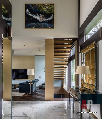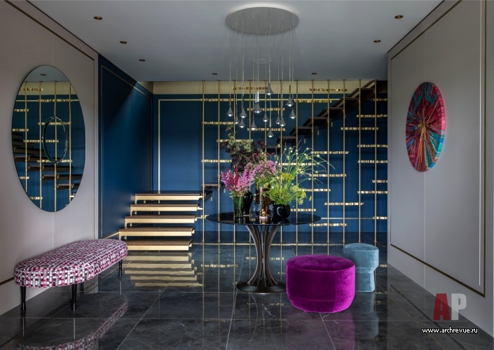 Холл первого этажа консоль Maxalto (модель Alcor), банкетка Moroso (модель Josephine) в ткани Rubelli