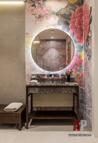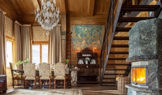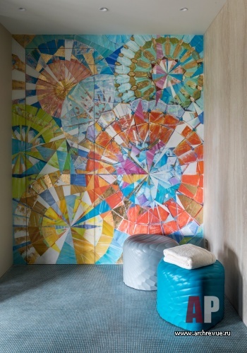 Интерьер задуман как продолжение пейзажа за окном: он полон ярких красок, природных фактур и растительных мотивов. Они обыграны ярко, свежо и экстравагантно. Орнаменты художественных витражей и декоративных панно масштабируют пространство и придают интерьерам изысканную декоративность.