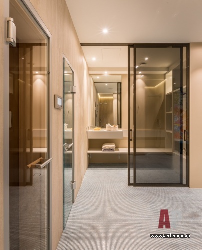 Комната отдыха при СПА многофункциональная композиция (мини бар, телевизионная консоль и диван с изголовьем, разделенная вертикальными ширмами) на заказ, по эскизам дизайнера; диван Rolf Benz (модель Onda), кресло B&B Italia (модель Husk), пуфы Tonon (модель River Stone), стол журнальный Poliform (модель Baba), стол Poliform (модель Flute)