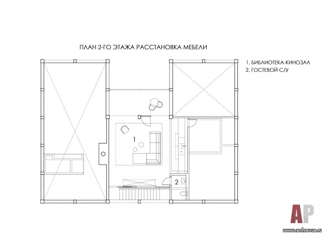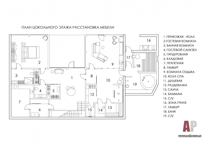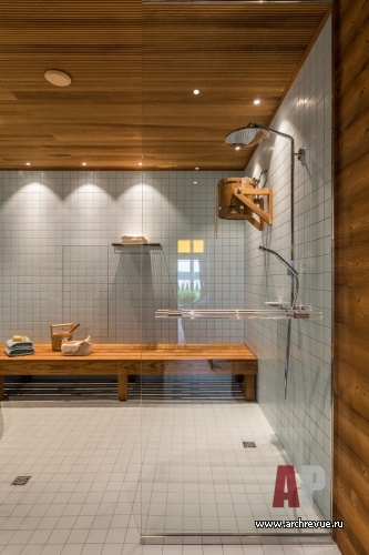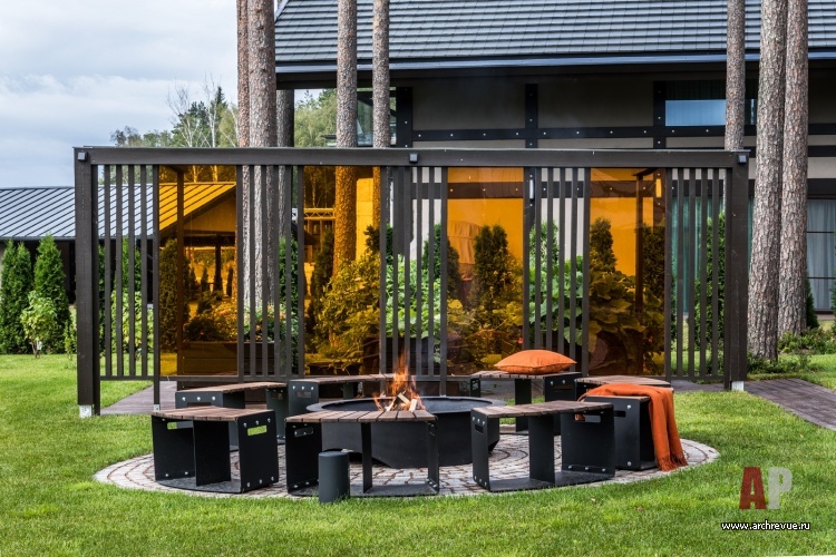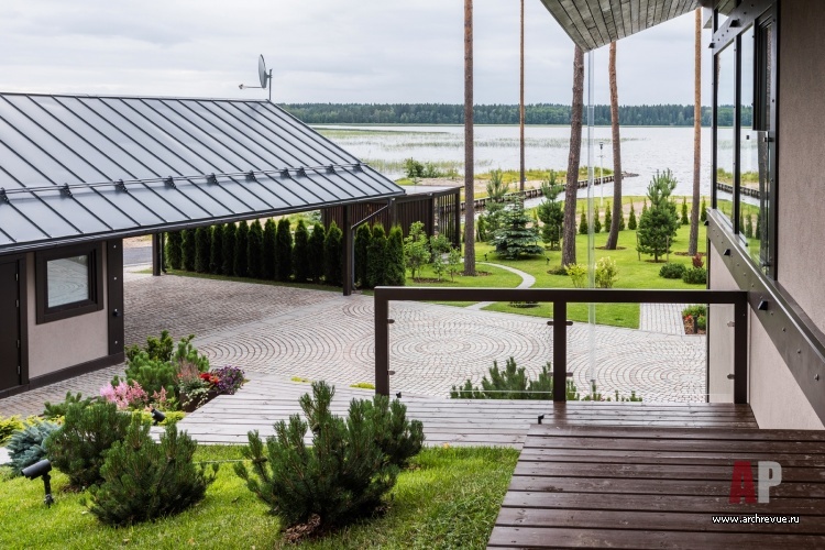 В цоколе спроектирован SPA-комплекс с парилкой, хаммамом, душем для двоих и купелью. Это пространство перетекает в комнату отдыха с большим диваном, а также мини-баром и телевизионной панелью. «Заказчики хотели, чтобы было место для уединения, беседы тет-а-тет, мы здесь сделали камерную зону с диваном, креслам и большим абажуром. С одной стороны от нее – реечная перегородка, с другой – выход на открытую террасу», - отмечает Юлия Черкун. На нижнем уровне также находится гостевая спальня с панорамным окном. Особенность планировки в том, что все основные помещения выходят на главную террасу с летней кухней или на внутреннюю галерею, с которой открывается вид на озеро.