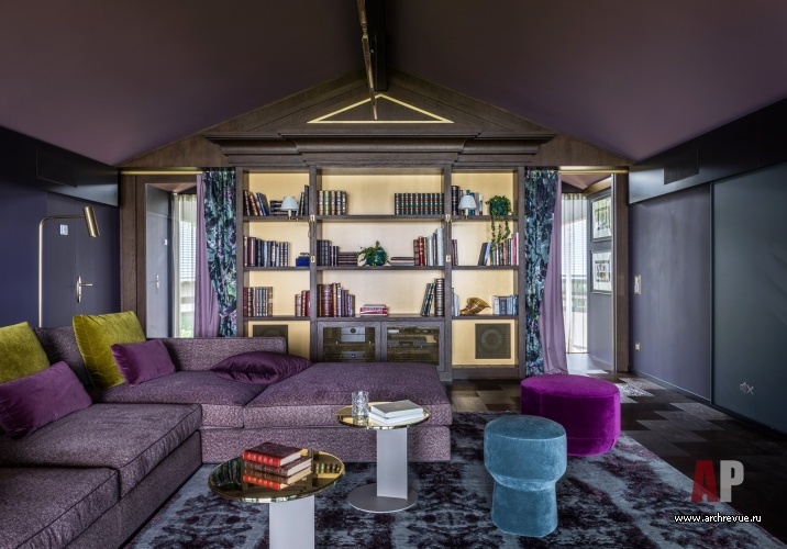 Кинозал книжный шкаф и многофункциональная композиция из книжных раздвижных шкафов с мини-баром на заказ, по эскизам дизайнера; диван Flexform (модель Richard), столики и пуфы Moroso, кресло Rolf Benz