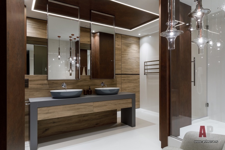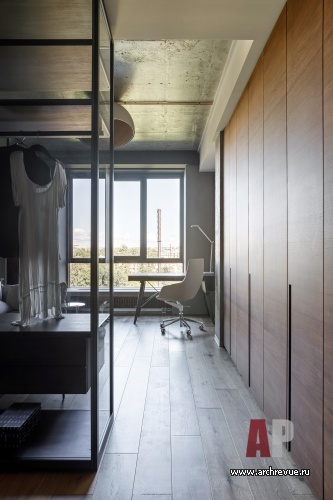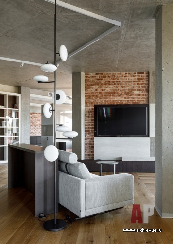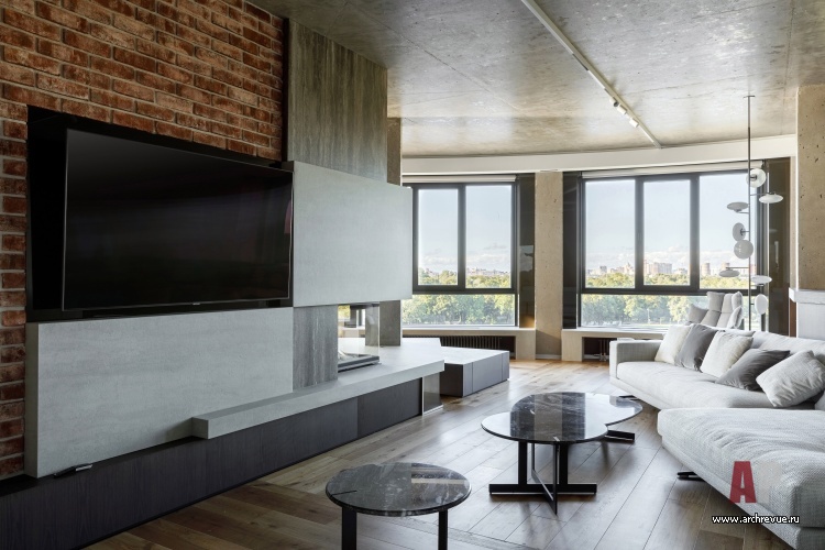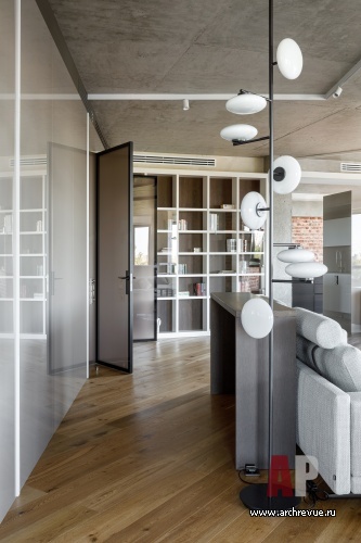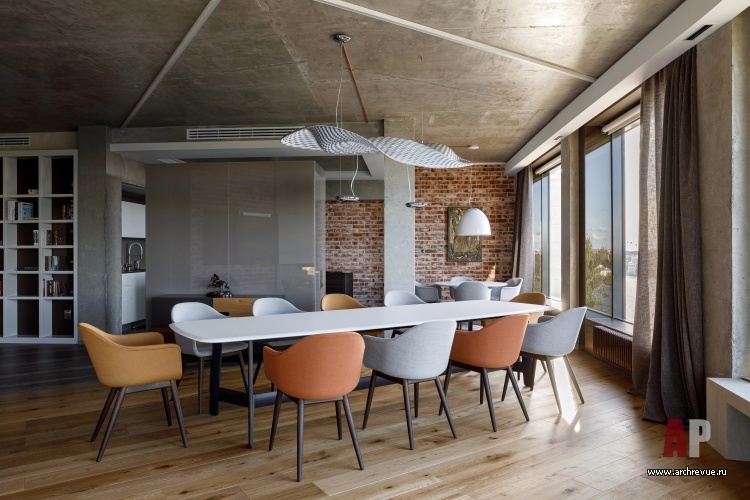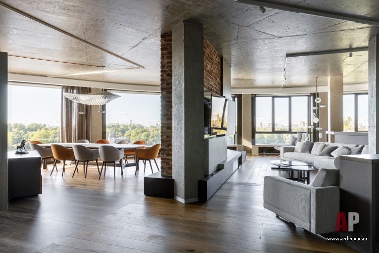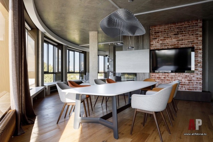 Доминантой здесь служит оригинальный панорамный камин на сложном постаменте, расположенном под углом к гостиной и столовой. Геометрия со сдвигом, простые крупные формы, брутальные материалы, световая тросировка потолков, открытая проводка с медными трубками формируют стильный урбанистический интерьер. Его смягчает фактура дерева, которой особенно много в приватных помещениях и кабинетах.