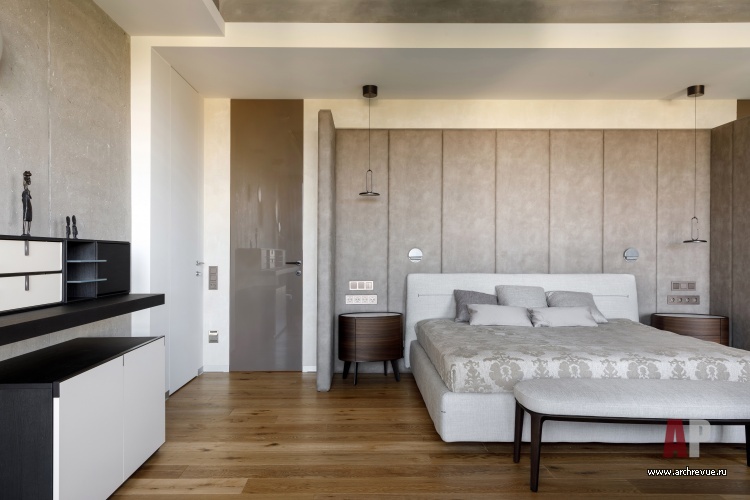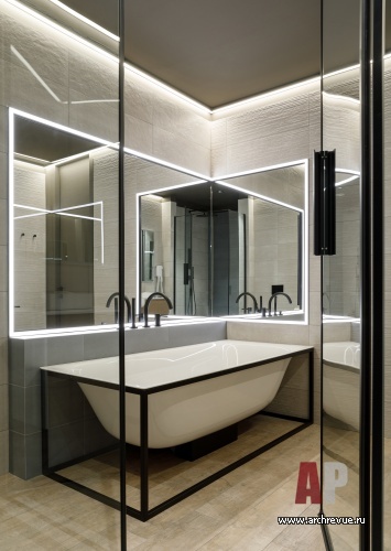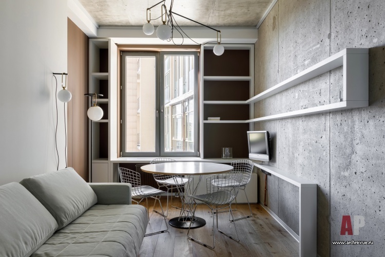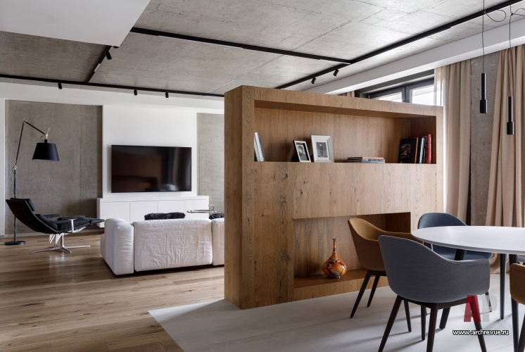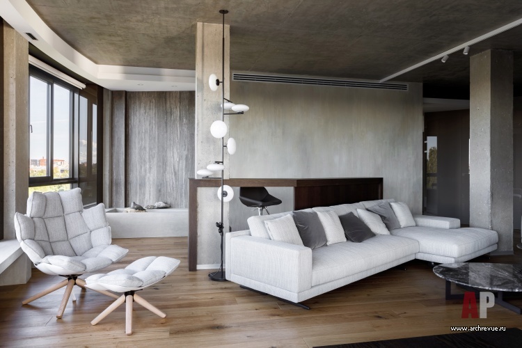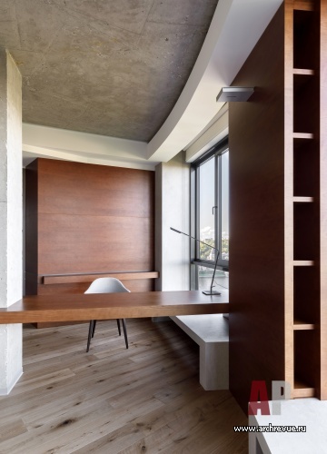 Стилистически он тяготел к минимализму с лаконичной геометрией и «острыми» формами, которые уравновешивают сложную исходную планировку с радиусной фасадной стеной и делают пространство более насыщенным.