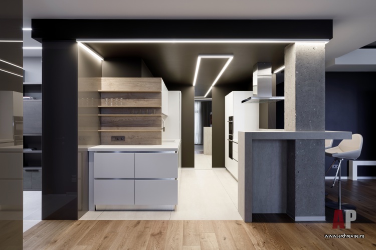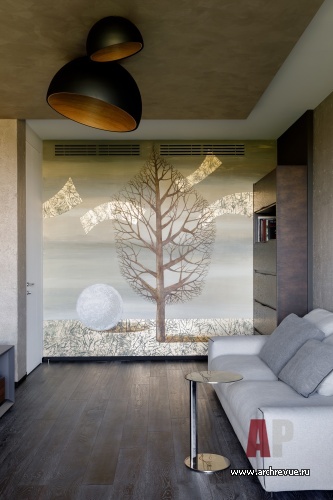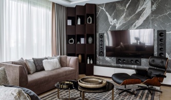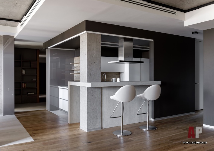 Первую квартиру заказчик купил около 10 лет назад (ее в свое время так же проектировал архитектор Андрей Галушко), а затем приобрел соседнюю, большую по площади. Андрей Галушко начала работу с глобальной перепланировки и нового зонирования: на площади с панорамным остеклением он разместил парадную часть с гостиной, кухней, столовой и панорамным камином (open space площадью более 130 кв. м) и родительским блоком.