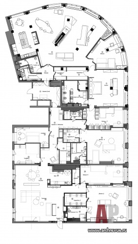 Архитектор Андрей Галушко объединил две соседние квартиры и сделал городское жилье для двух поколений семьи с полностью автономной детской зоной. Квартира площадью более 500 кв. м. расположена в жилом комплексе на набережной Малой Невки в Санкт-Петербурге. Заказчик поставил задачу спроектировать своего рода дуплекс: родительскую и детскую квартиры с независимым друг от друга функционалом и общей парадной частью.
